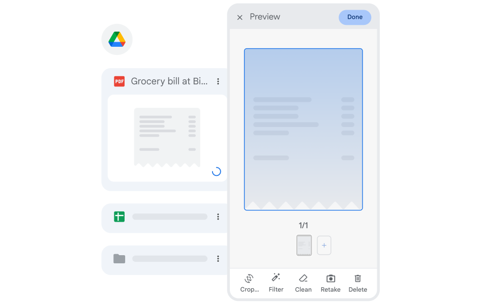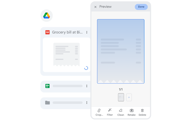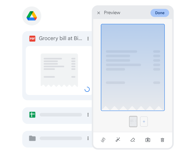 Quickly scan and store receipts, billing statements and more as searchable PDFs, directly from the Drive app for Android or iOS.